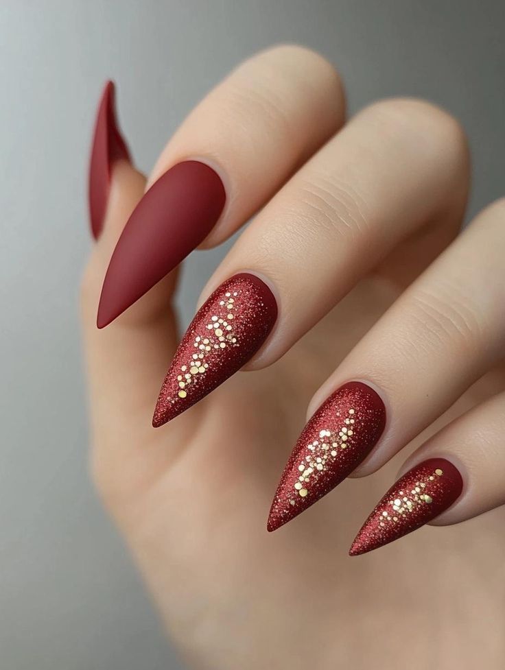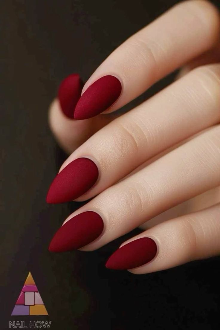 3. ناخنهای مات: لاک قرمز مات به ناخنها ظاهری خاص و متفاوت میبخشد. این طراحی معمولاً با یک لایه برق ناخن ترکیب میشود.