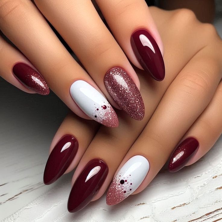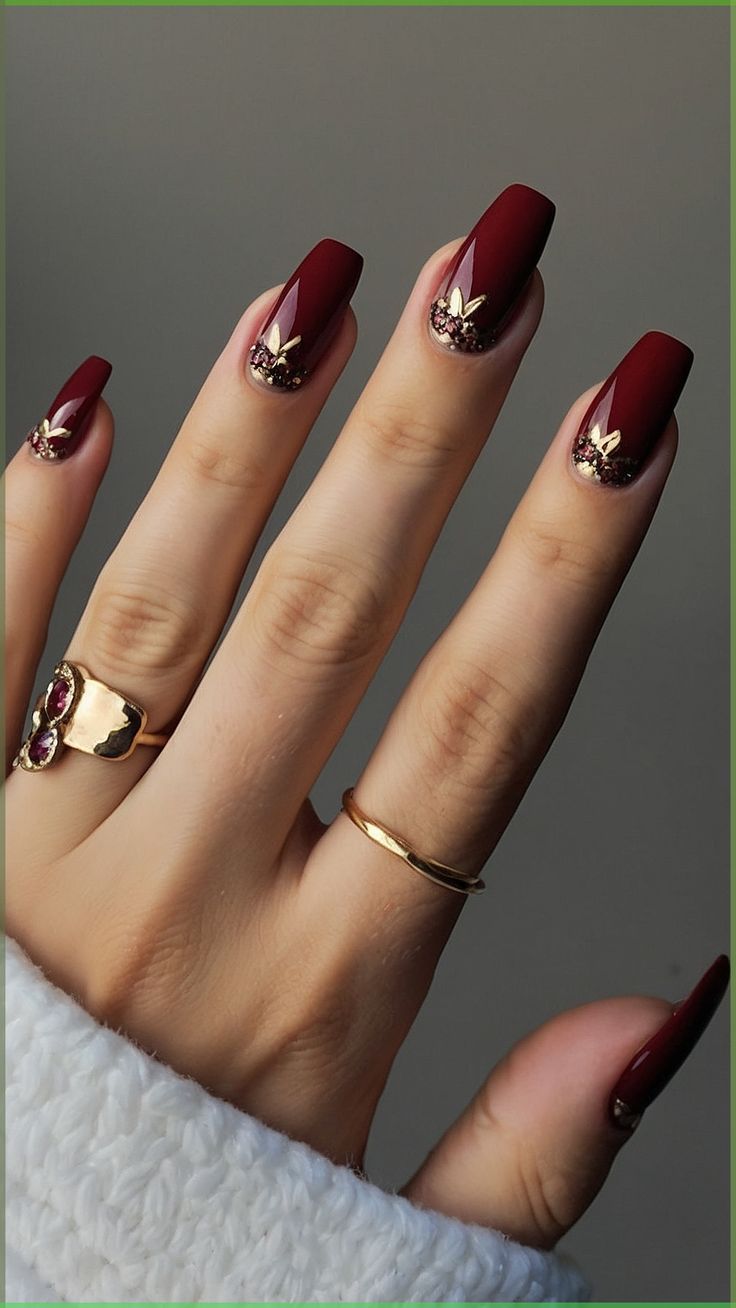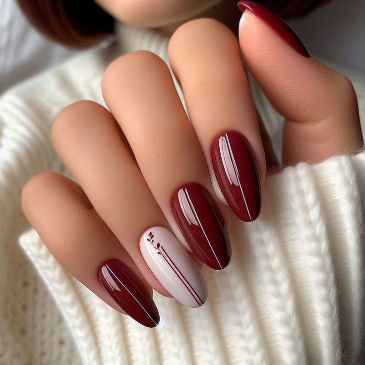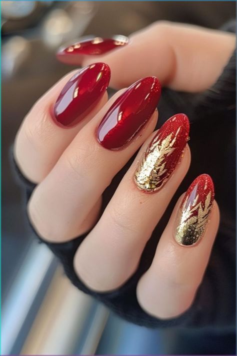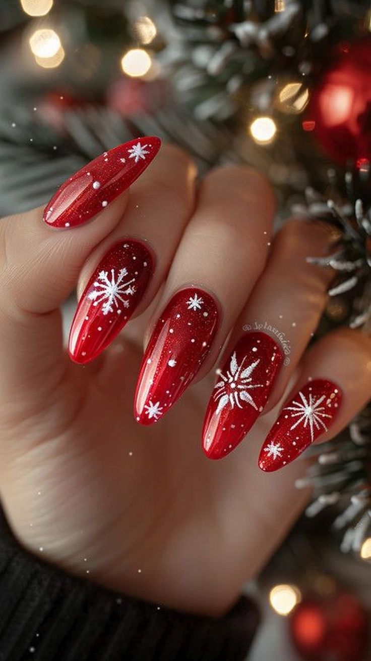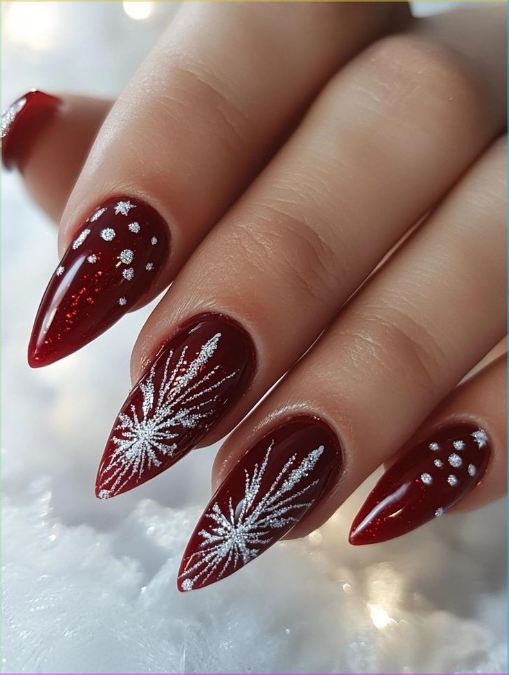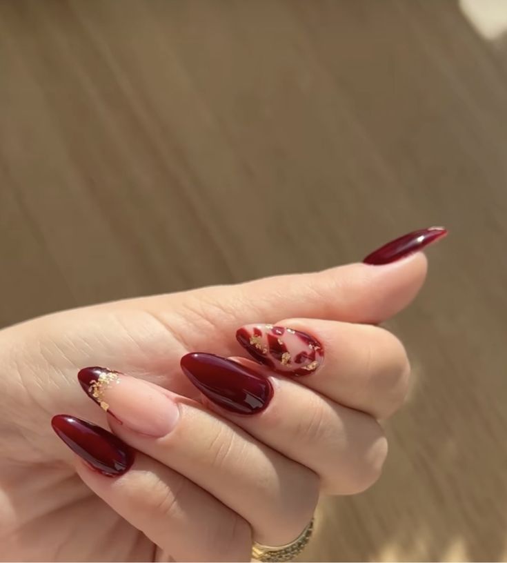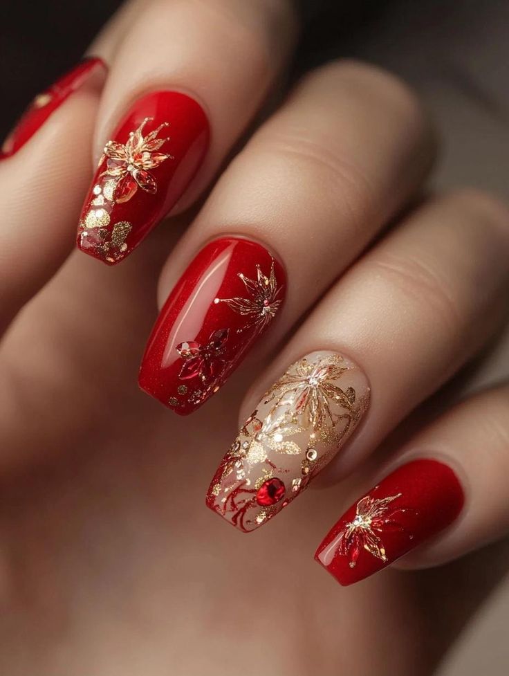 4. طراحی گل یا الگو: میتوانید با استفاده از لاکهای سفید یا طلایی، طرحهای گل یا الگوهای هندسی روی ناخنهای قرمز ایجاد کنید.