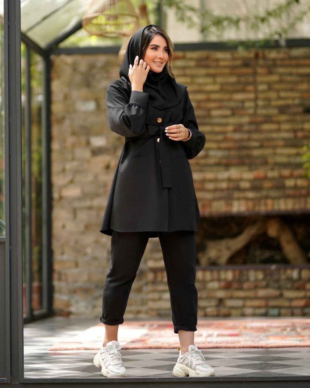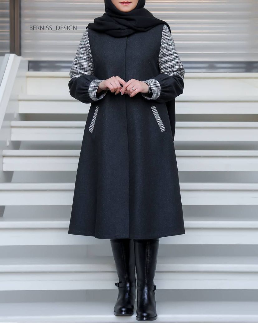 - پالتوی دو دکمه کلاسیک همراه با مقنعه، ظاهری رسمی و دانشجویی میسازد.