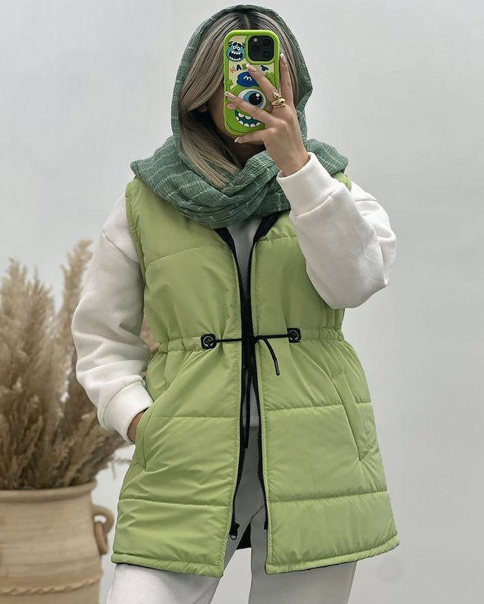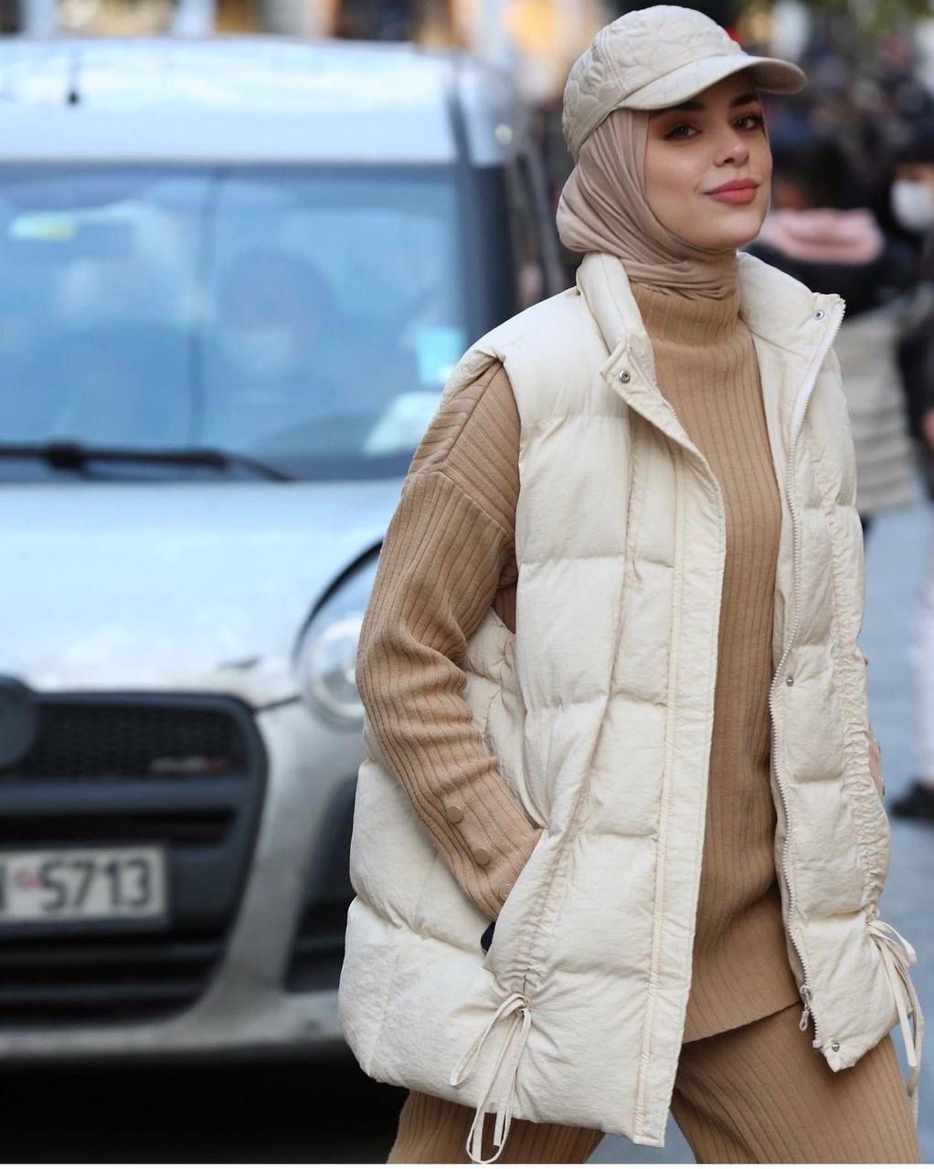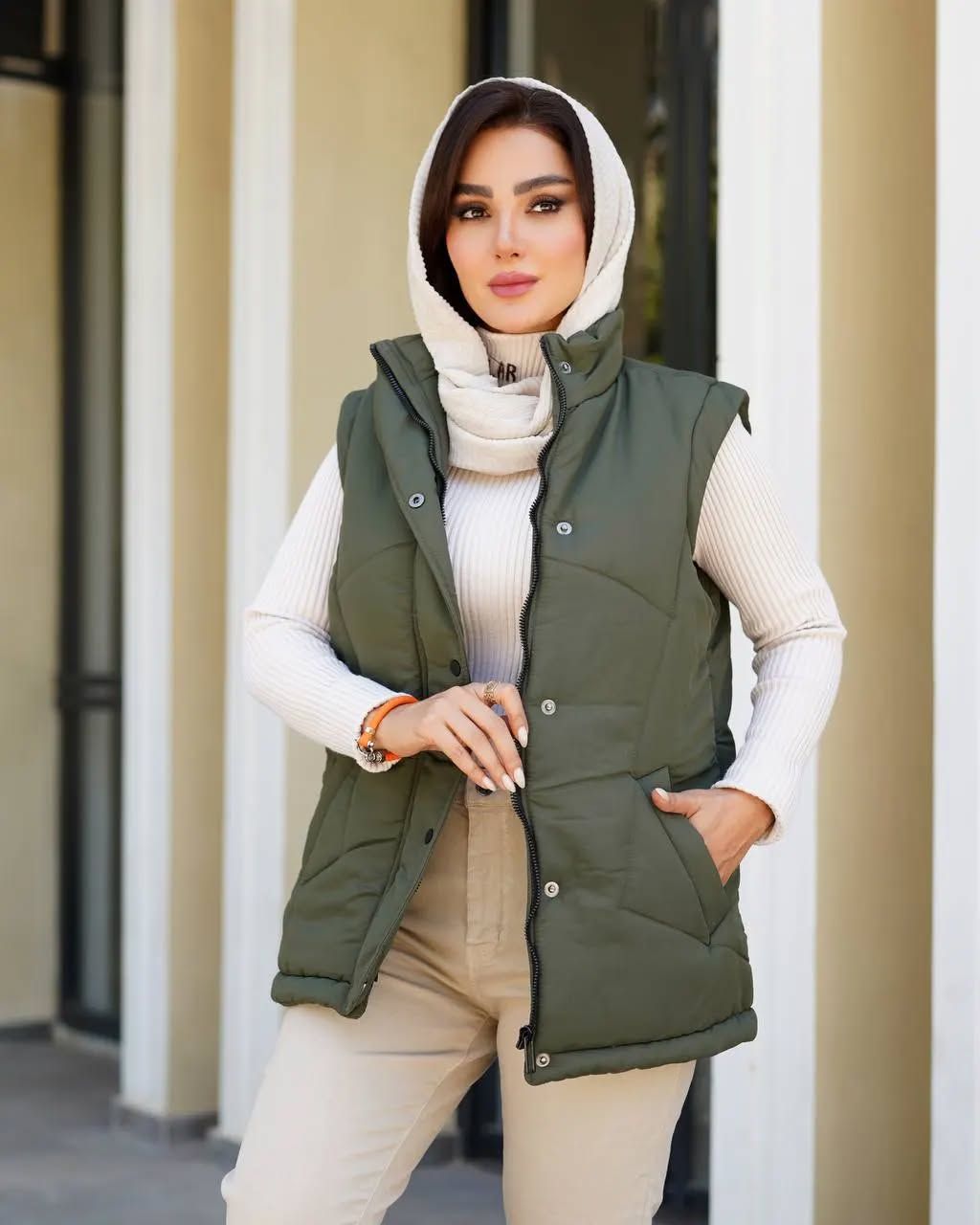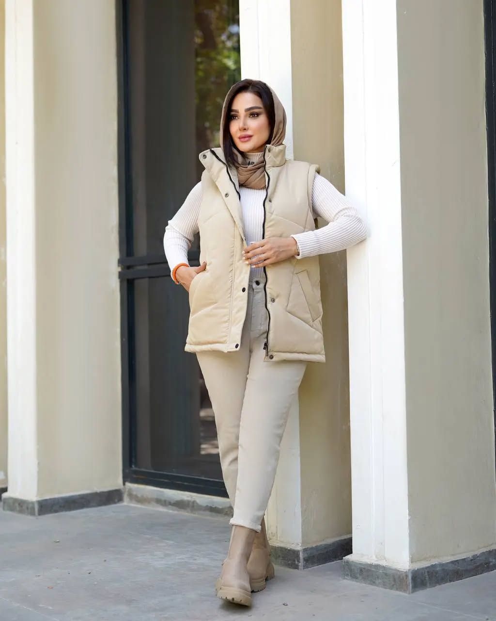 - کلاه و شال: از کلاههای بافتنی ضخیم و شالهای پشمی استفاده کنید. تضاد بافت شال نرم با رویه صاف پافر، جذابیت ایجاد میکند. بهتر است رنگ کلاه یا شال را با رنگ لایه میانی (هودی یا پولیور) هماهنگ کنید.