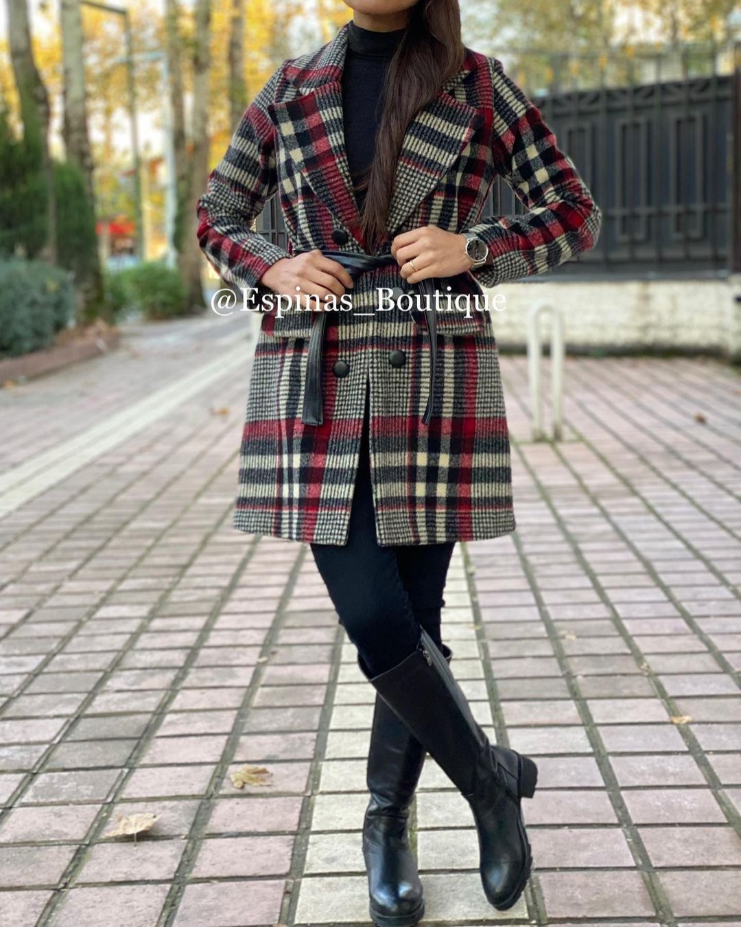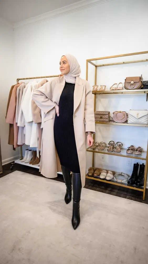 استایل پالتو بلند و دامن کوتاه و بوت بلند