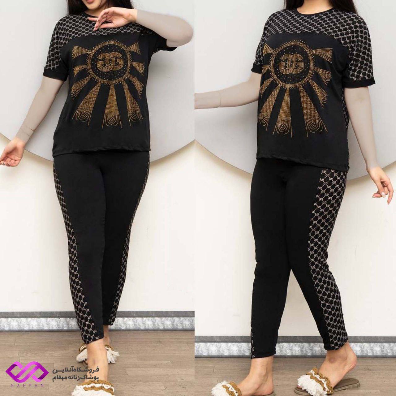 تولیدی مهفام این لباس خانگی شیک را با یک ساپورت مشکی که در دو طرف پارچه پلنگی به کار رفته و فاق بسیار خوب و راحتی دارد ست کرده است درضمن کمر ساپورت سرخود می باشد و پایین شلوار از خود پارچه تا و میاندوز شده است.